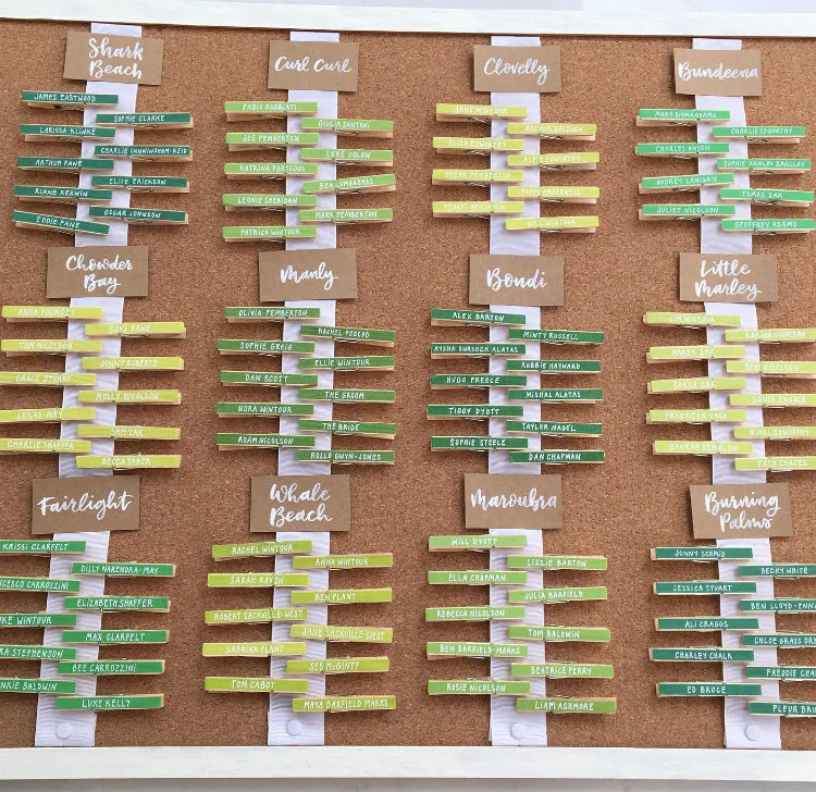 From huge piles of luggage tags on suitcases to cricket bats, escort cards and ribbons covered in pegs (so you can move the table plan around up to the very last minute), here are some examples of my table plans, signage and marquee decorations to inspire your creativity…